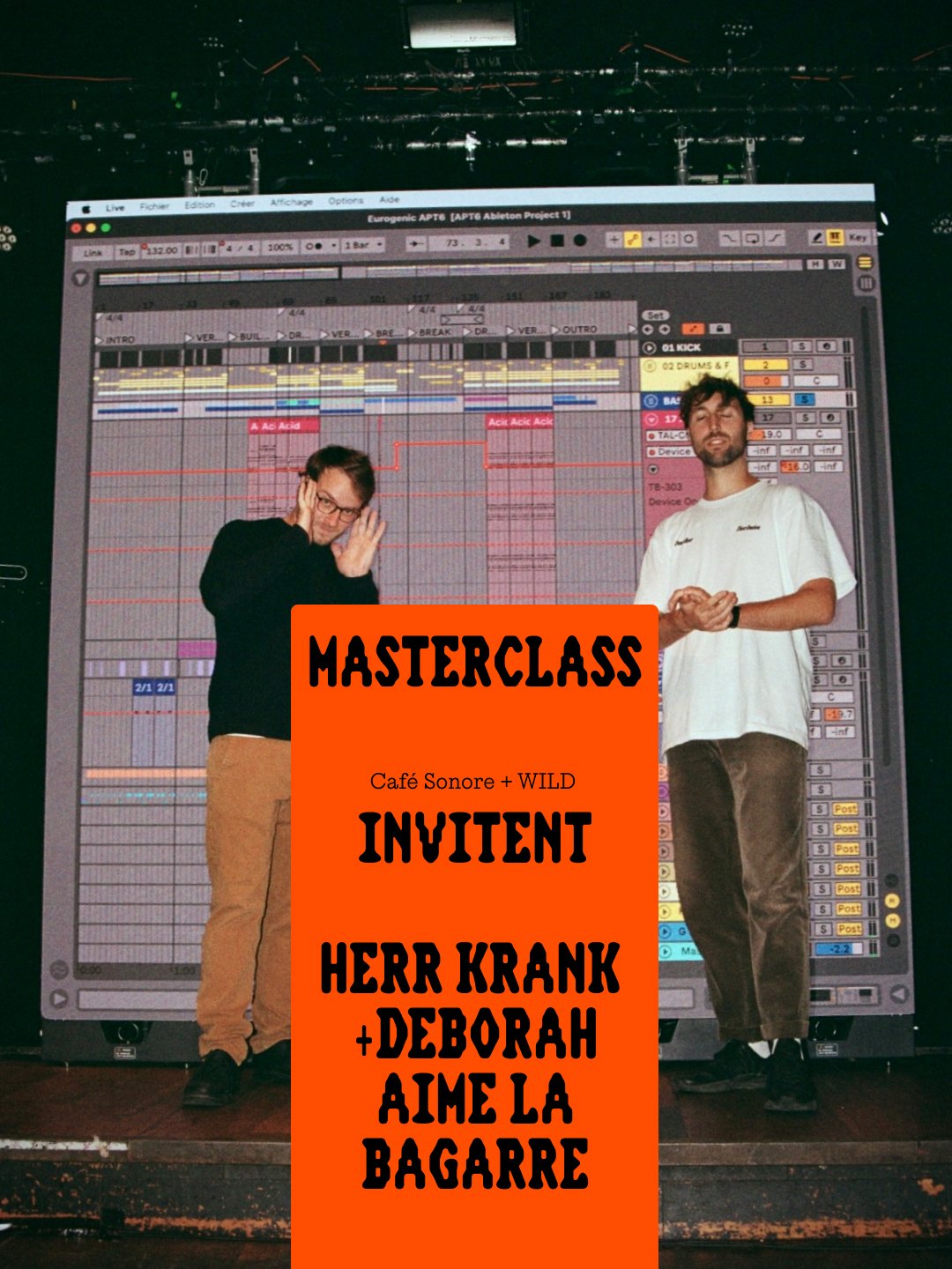 Dans le cadre de leur venue à Bordeaux pour la soirée Animal Clubbing organisée par WILD à Bien Public, Deborah Aime La Bagarre et Herr Krank vous invitent au Café Sonore pour 2H de masterclass / discussion autour de la production de musique électronique.